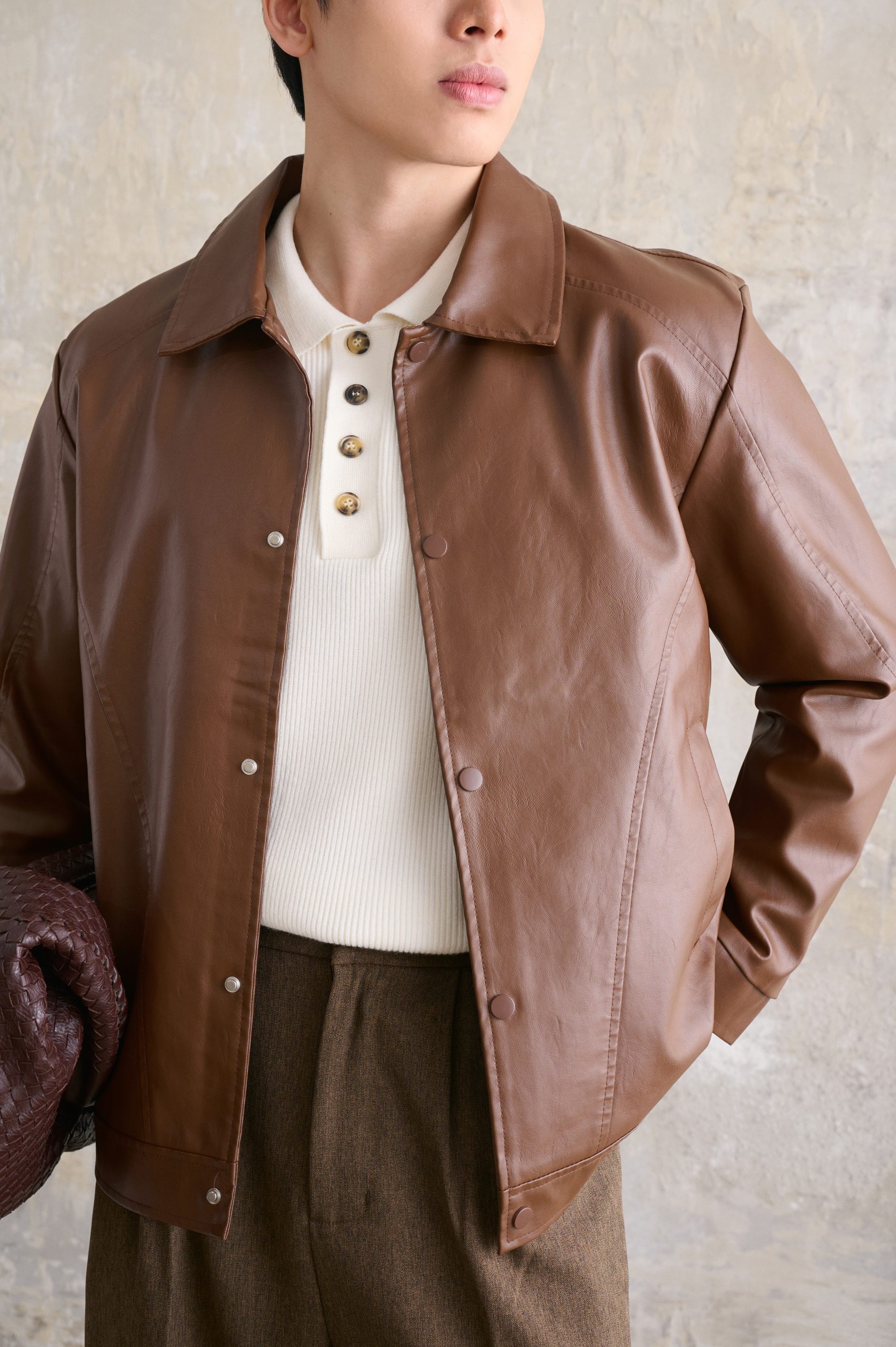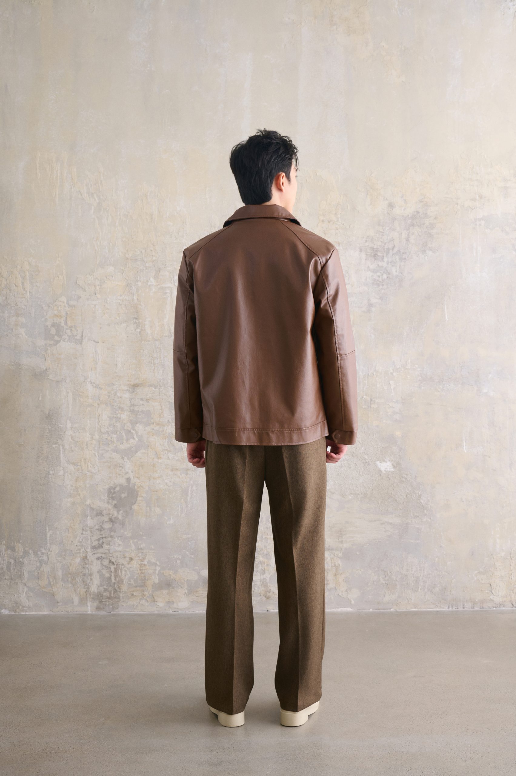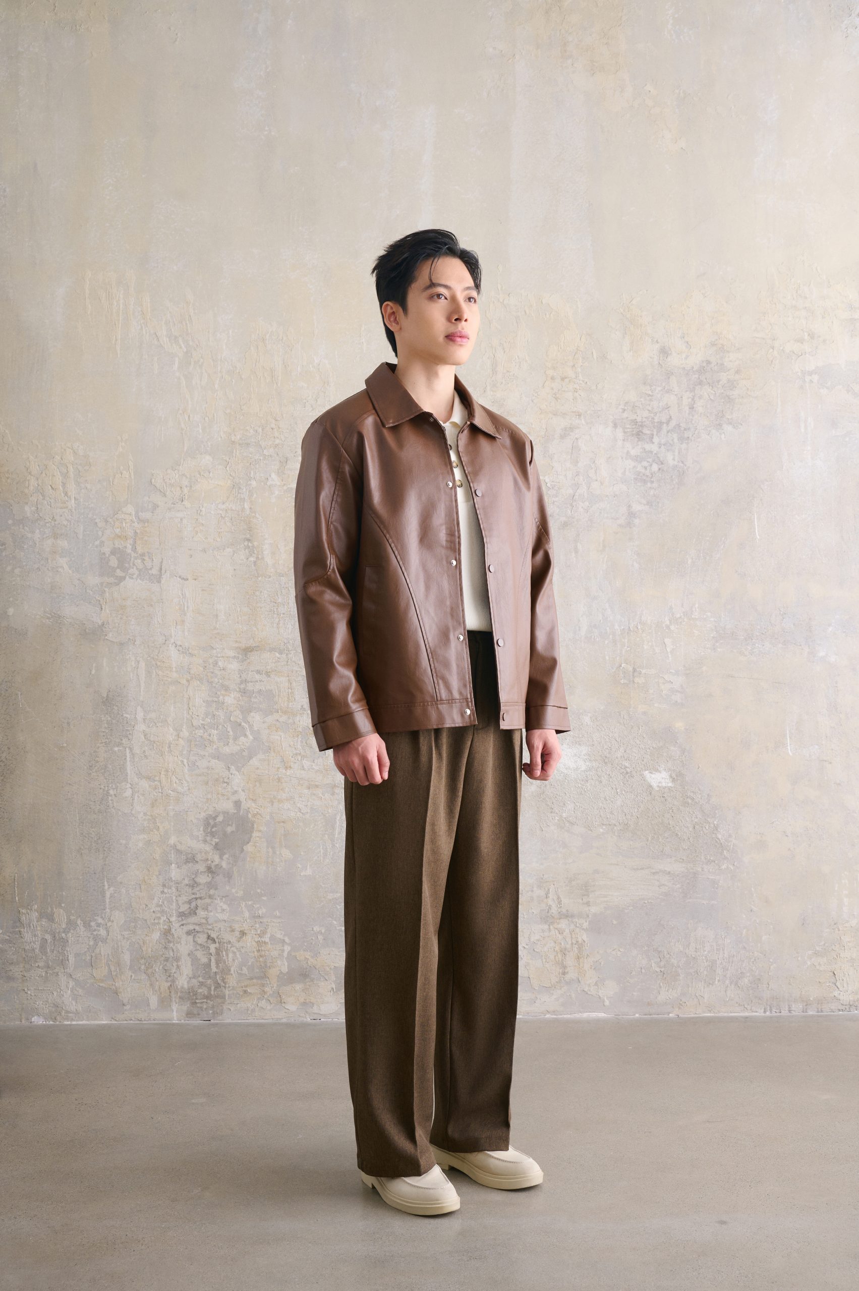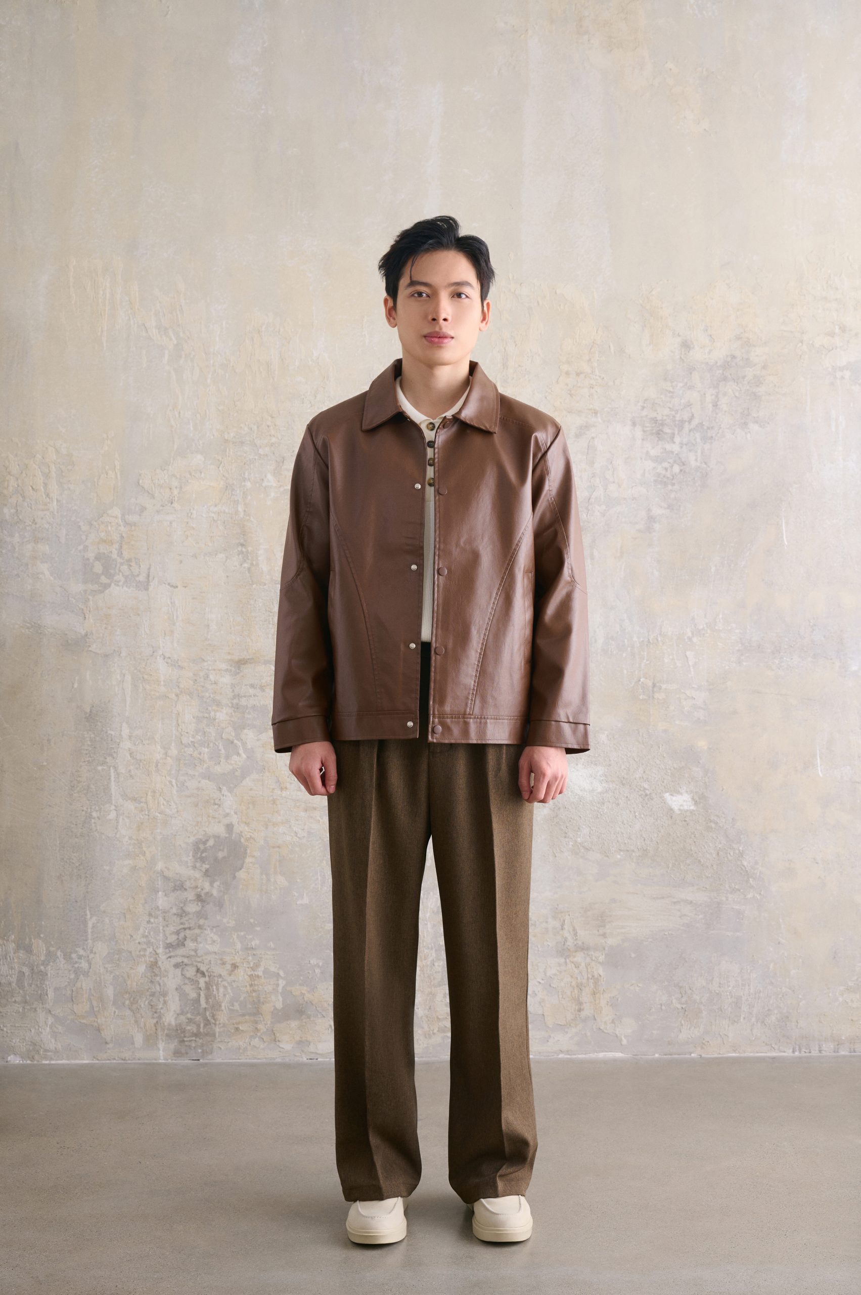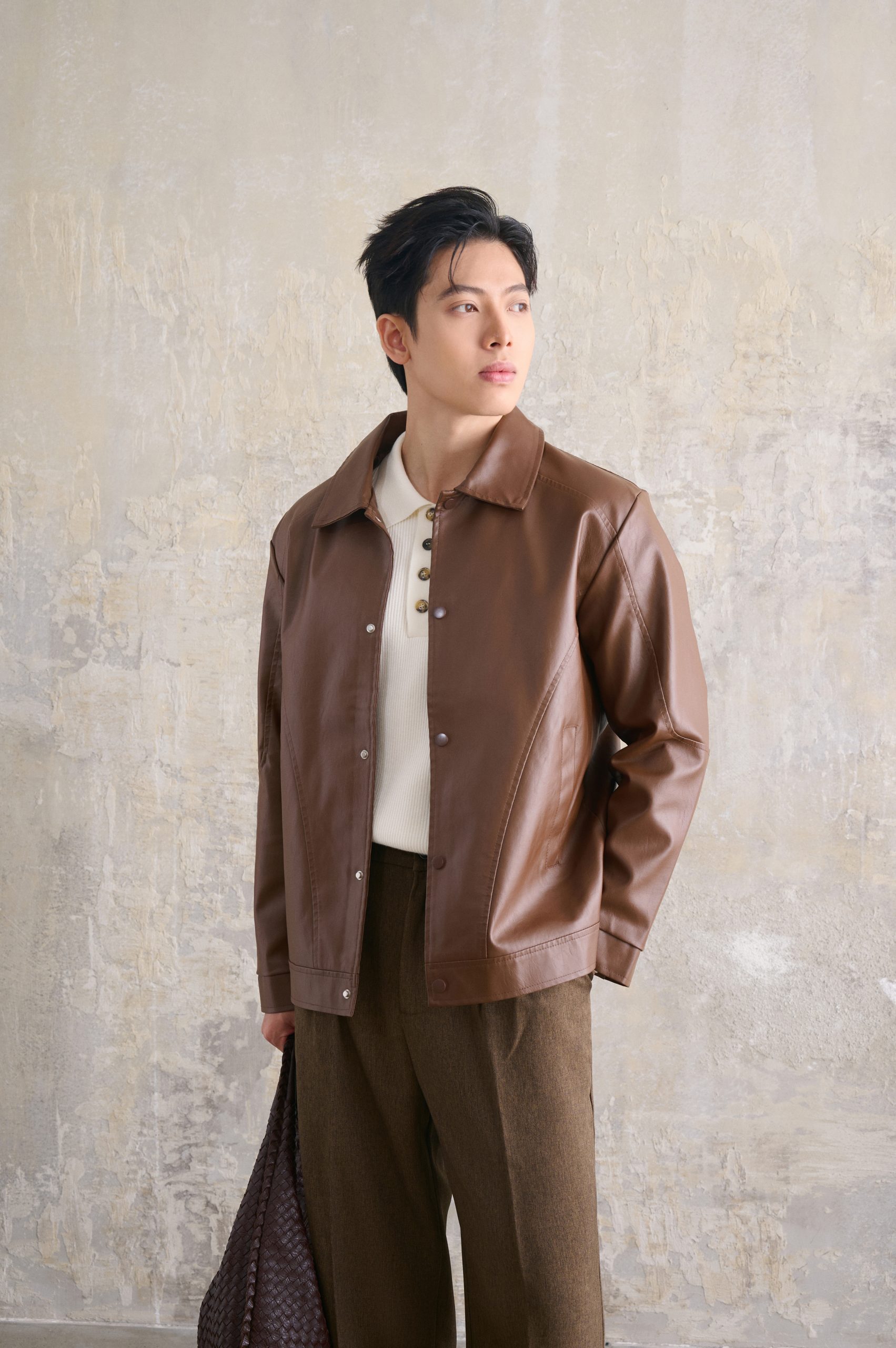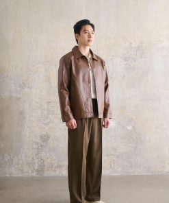 Bên cạnh đó, tông màu nâu trầm đặc trưng của áo khoác da cổ bẻ giúp outfit dễ phối đồ, phù hợp với nhiều phong cách và không lo lỗi mốt theo thời gian.